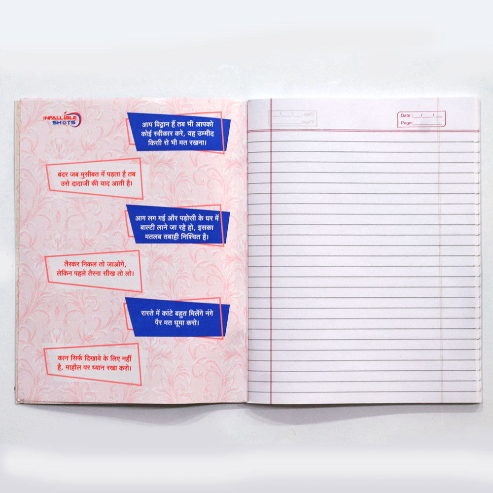 Presenting the exclusive Leadership Infallible Shots Exercise book Soft Bound, which is fit to be used for Office Staff, School, College, Coaching Students and even as a Gift! The Notebook comes with Whiteback Duplex 296 GSM Gloss Laminated Beautiful Colorfull Cover with Inspirational line,Includes 23 specially designed motivational Hindi quotes, that gives this notebook a very special meaning both as a personal belonging, This notebook is perfect for regular working. 180 Single Line Pages.