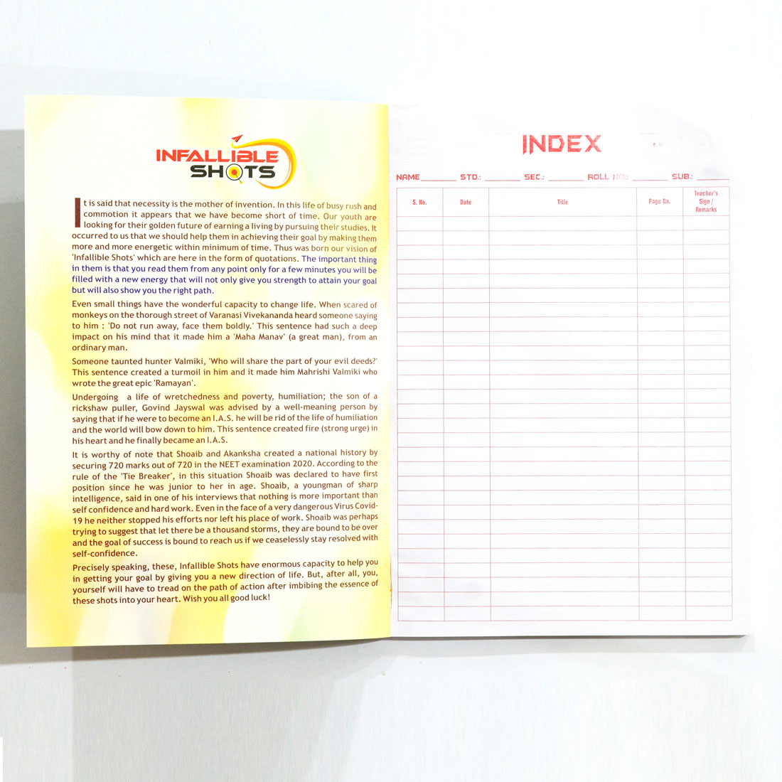 Presenting the exclusive Learning Infallible Shots A4 Register Soft Bound, which is fit to be used for Office Staff, School, College, Coaching Students and even as a Gift! The Notebook comes with 250 GSM SBS Gloss Laminated Beautiful Colorfull Cover with Inspirational line,Includes 63 specially designed motivational english quotes, that gives this notebook a very special meaning both as a personal belonging, This notebook is perfect for regular working. 312 Single Line Pages.