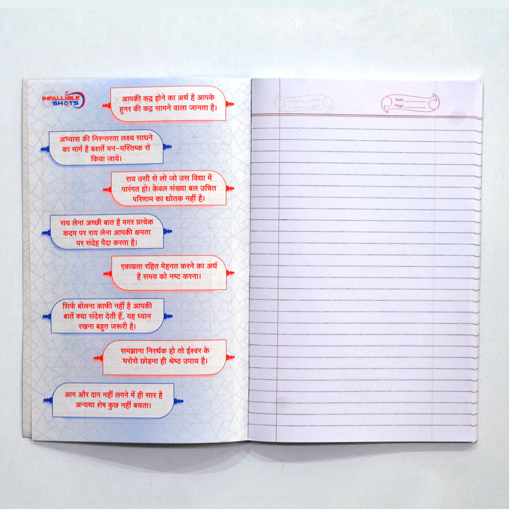 Presenting the exclusive Peacock Infallible Shots College Note book Soft Bound, which is fit to be used for Office Staff, School, College, Coaching Students and even as a Gift! The Notebook comes with Whiteback Duplex 296 GSM Gloss Laminated Beautiful Colorfull Cover with Inspirational line,Includes 31 specially designed motivational Hindi quotes, that gives this notebook a very special meaning both as a personal belonging, This notebook is perfect for regular working. 160 Single Line Pages.