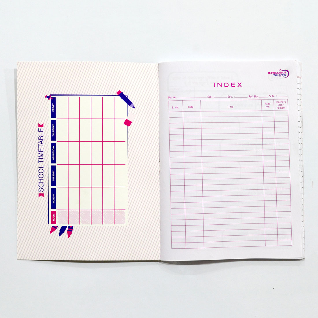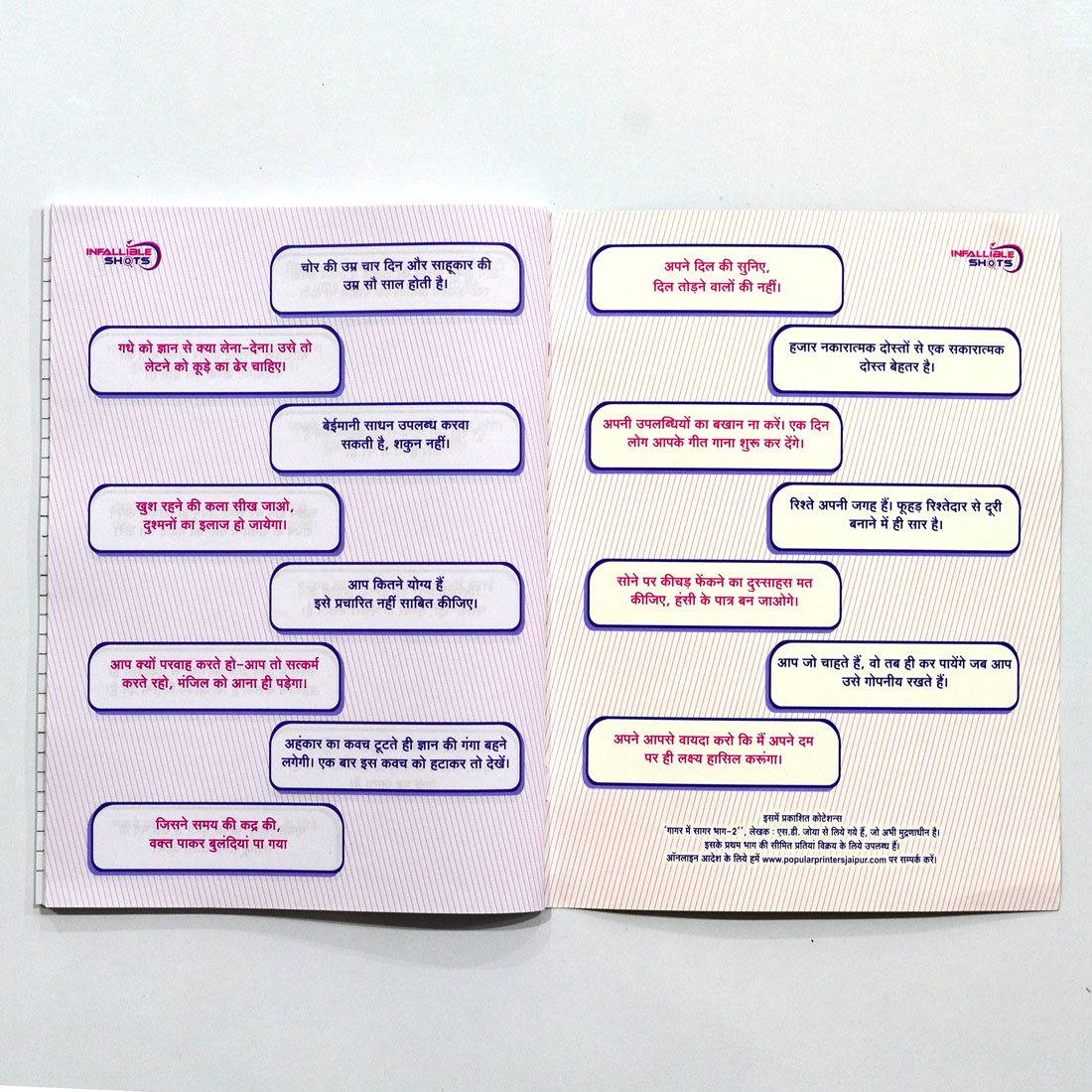 Presenting the exclusive Start Infallible Shots A4 Register Soft Bound, which is fit to be used for Office Staff, School, College, Coaching Students and even as a Gift! The Notebook comes with 250 GSM SBS Gloss Laminated Beautiful Colorfull Cover with Inspirational line,Includes 71 specially designed motivational Hindi quotes, that gives this notebook a very special meaning both as a personal belonging, This notebook is perfect for regular working. 224 Single Line Pages.