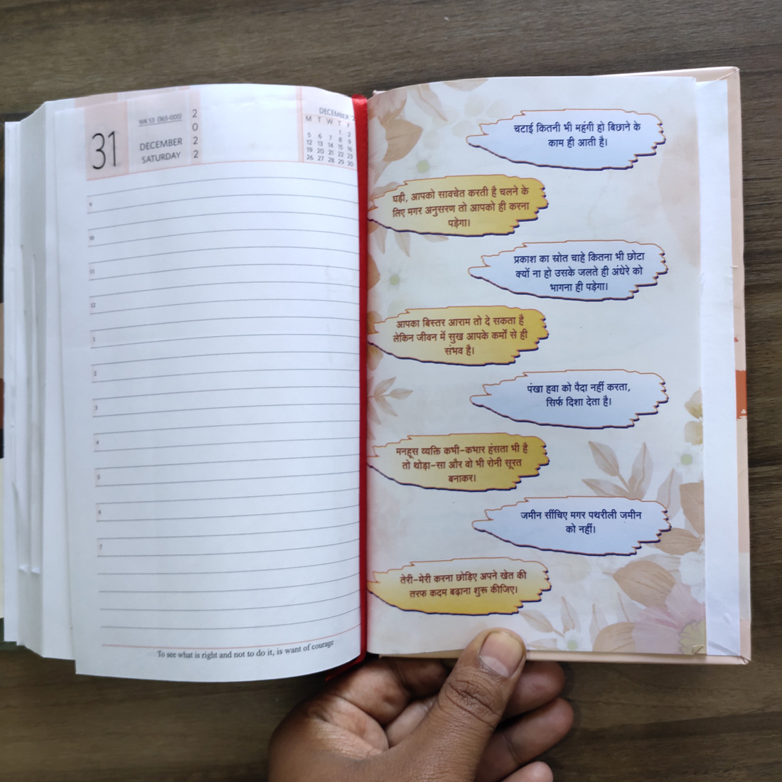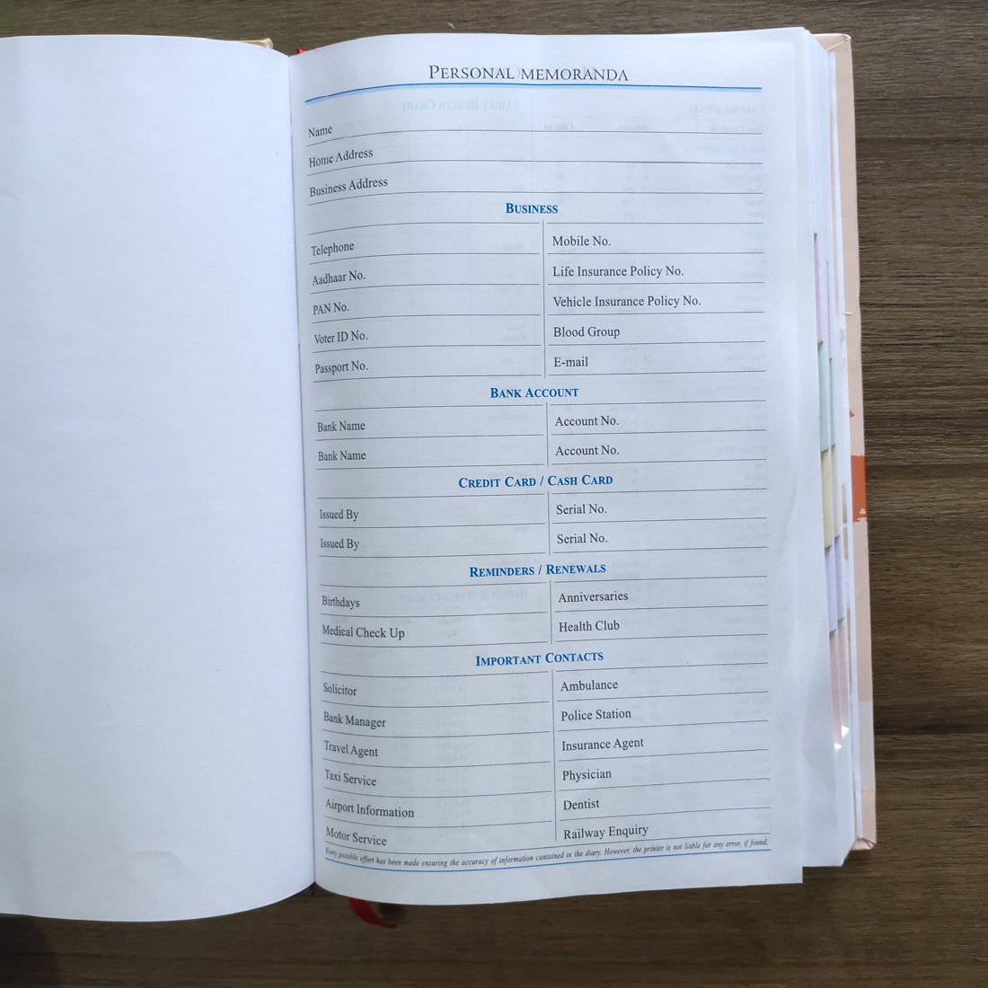 * Includes English Motivational Quote on Every Page, Cardboard binding, Paper are 60 GSM, Printing in Six color “Important Pages contain, Personal Memoranda, Health guide : Calorie Chart, Family Health, Height Weight, Important S.T.D. codes, Important I.S.D. Codes, Weight & Measure, Metric Information, World Time Chart, World Currencies, Average Temperature in Major Cities, World Air Distance, Container Details for Import Export